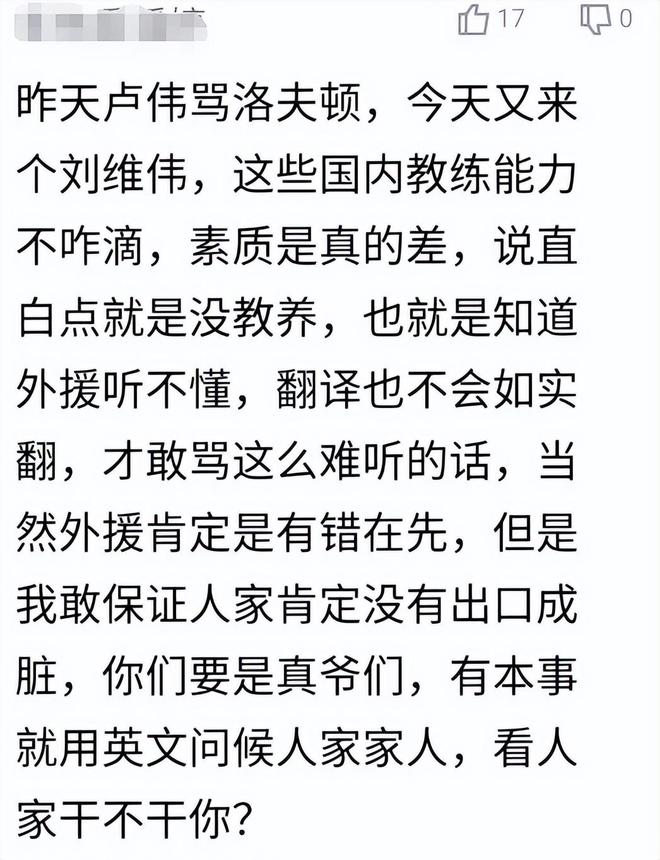 昨天卢伟骂洛夫顿,今天又来个刘维伟,这些国内教练能力不咋滴,素质是真的差,说直白点就是没教养,也就是知道外援听不懂,翻译也不会如实翻,才敢骂这么难听的话,当然外援肯定是有错在先,但是我敢保证人家肯定没有出口成脏,你们要是真爷们,有本事就用英文问候人家家人,看人家干不干你?