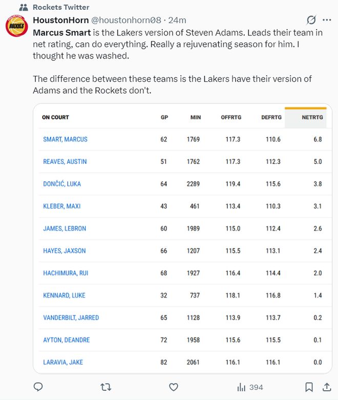 休媒都被他打服了:斯玛特就是湖人版本的亚当斯,他常规赛净效率值+6.8是湖人最高的,他在球场上似乎无处不在,我原本以为他就要就此陨落没想到在LAL焕发生机,可火箭的亚当斯却因伤无法登场。