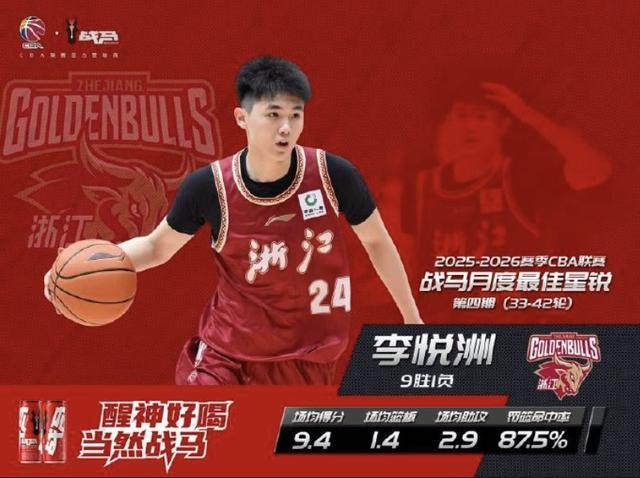CBA官方写道:恭喜浙江稠州篮球俱乐部球员李悦洲获得2025-2026赛季CBA联赛第4期月度最佳星锐球员!