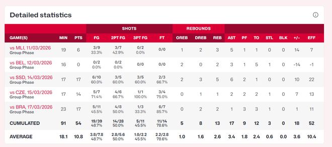 王思雨在世资赛的最后三场比赛分别拿到17分6助攻、14分2助攻、17分1助攻,五场比赛场均18.1分钟,拿到10.8分3.4助攻2.6篮板0.6抢断,命中率48.7%,三分命中率45.5%。