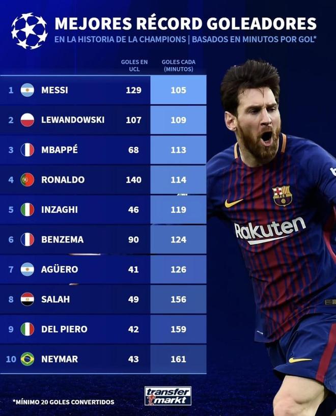 欧冠历史最佳射手效率榜 | 按每粒进球所需分钟数统计