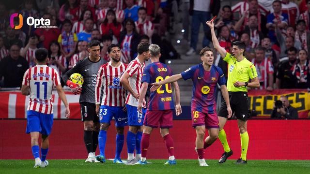 西甲第30轮,巴塞罗那客场对阵马德里竞技,上半场马竞前锋尼古拉斯-冈萨雷斯因犯规染红,至此,巴萨本赛季西甲已有4名对手球员在上半场被罚下,为五大联赛并列最多。