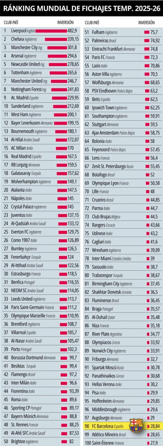 为了说明背景,以下是转会支出超过巴萨的俱乐部数量分布:英格兰27家(前11名中占了10家),意大利16家,德国10家,法国9家,沙特阿拉伯6家,巴西5家,西班牙4家(马竞、皇马、比利亚雷亚尔和贝蒂斯),葡萄牙4家,土耳其4家,荷兰3家,希腊2家,俄罗斯2家,以及比利时、苏格兰、美国、乌克兰、卡塔尔和阿根廷各1家。