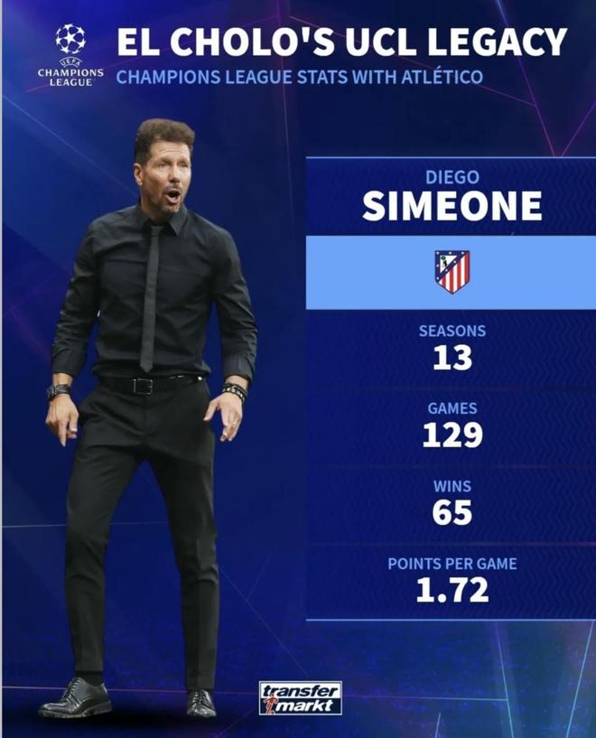 最近转会市场列出了一份欧冠主帅历史积分榜,西蒙尼排在第6。排在他前面的依次是安切洛蒂、瓜迪奥拉、弗格森、温格和穆里尼奥。如果单看冠军数量,西蒙尼确实吃亏。但如果把执教的平台、球队的资源以及持续带队的时间都算进去,他这个第6名其实很不简单。根据欧足联最新的数据,安切洛蒂带队打了218场欧冠赢下124场,瓜迪奥拉189场117胜,穆里尼奥154场80胜,西蒙尼则是126场63胜,全都是历史顶级水平。最关键的是,西蒙尼这126场几乎全是在马竞一家俱乐部完成的。在这些顶级教练里,这种长期在同一支球队持续打出成绩的情况非常罕见。